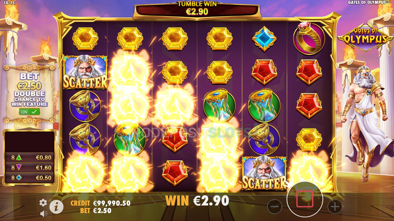Zeus fungerar som scatter-ikon, som ser ut som en lysande figur som utlöser gratissnurr-attributet. Dessutom kan multiplikatorklot landa slumpmässigt under varje snurr och presentera värden från 2x till 500x som relaterar till den aktuella vinsten.